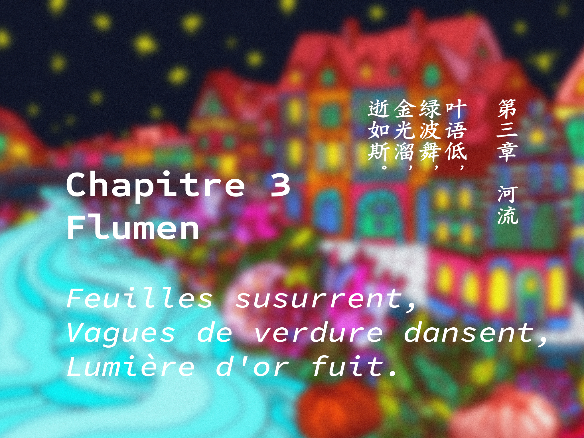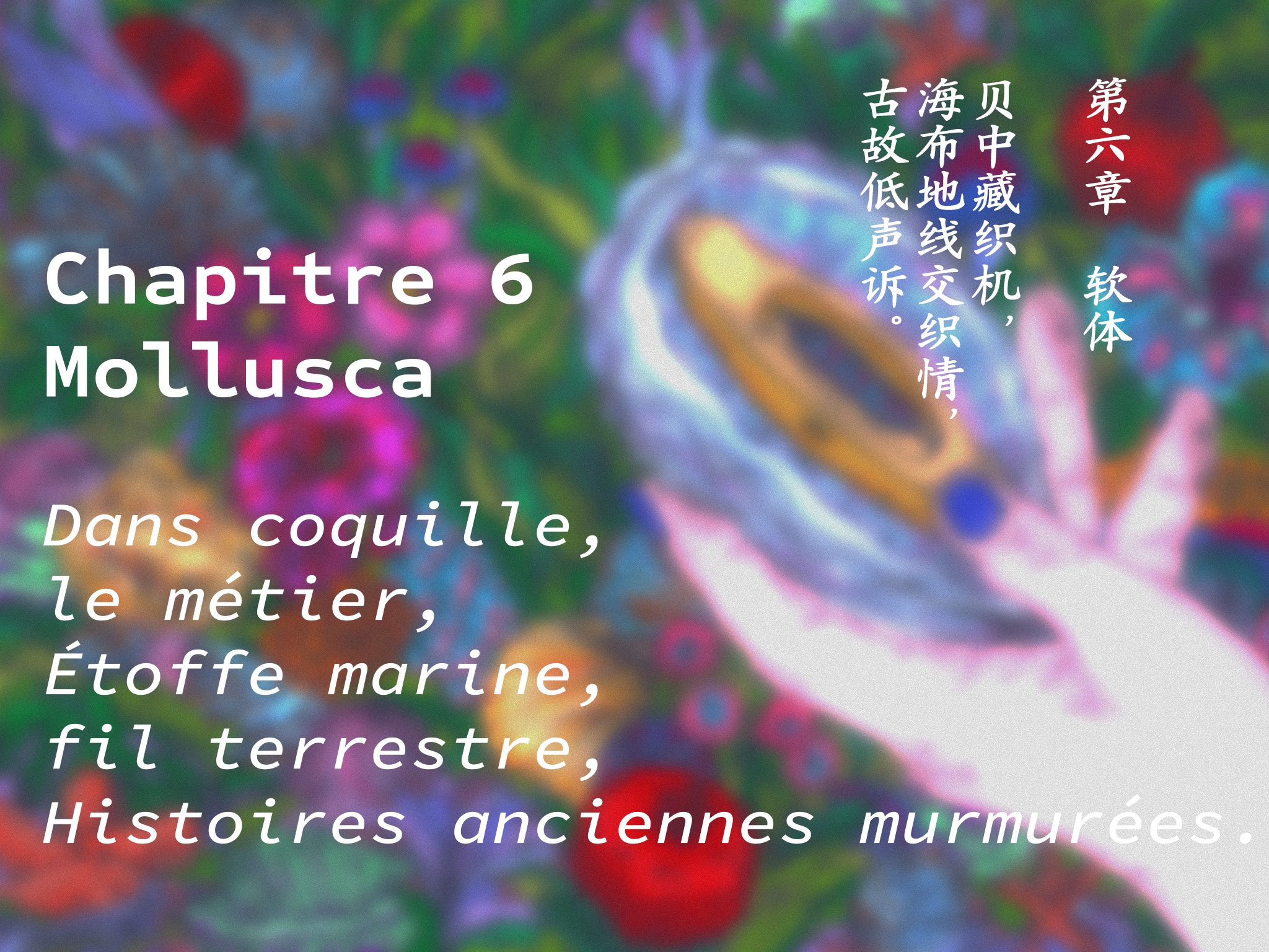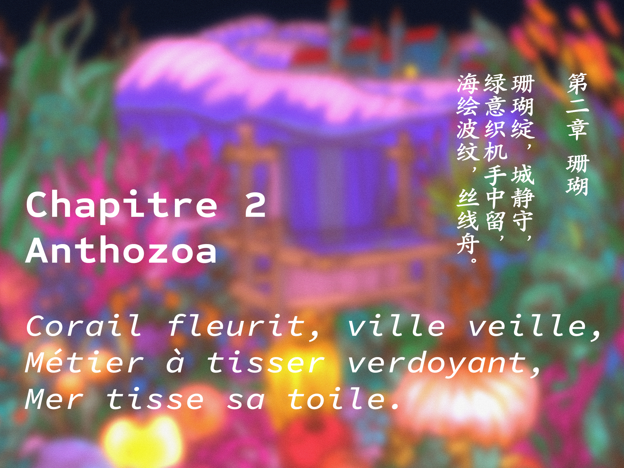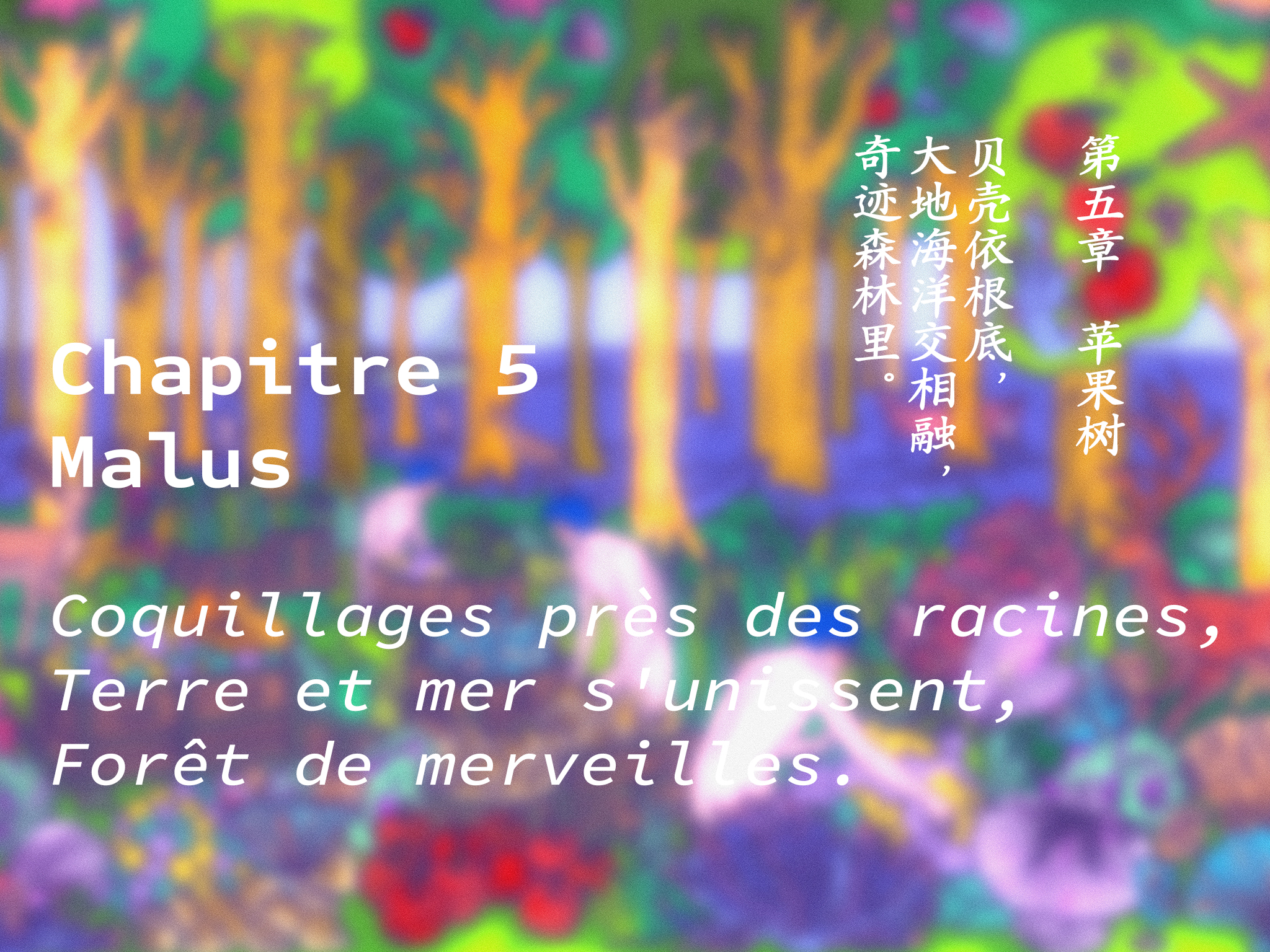 Le site web panorama et effet 360 AR/VR présentent six scènes de la prophétie : Spiralis, Anthozoa, Flumen, Laminaria, Malus et Mollusca, chacune nommée d'après le nom biologique d'une plante marine ou terrestre intégrée à la scène. Chaque chapitre s'ouvre sur un haïku ou un quatrain, évoquant le prologue de chaque acte.